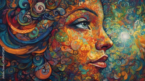 Naklejka premium A vibrant, abstract portrait blending colors and intricate patterns.