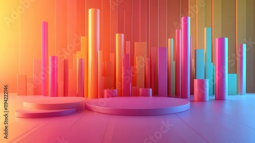 Obraz premium A vibrant, abstract scene featuring colorful cylindrical shapes and circular platforms, set against a gradient background.