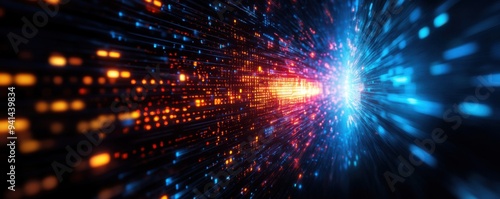 © Pakkarada, Naklejka premium A vibrant abstract scene showcasing dynamic light trails in blue and orange, representing motion and technological energy.