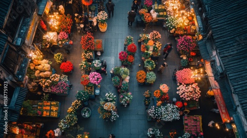 Naklejka premium A vibrant aerial view of a bustling flower market at night