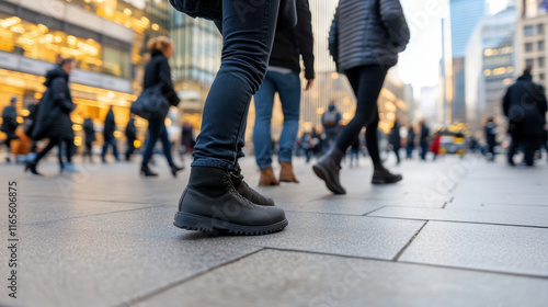 Naklejka premium A vibrant and bustling scene of a group of people walking down a sidewalk, capturing the essence of urban life - Humanity