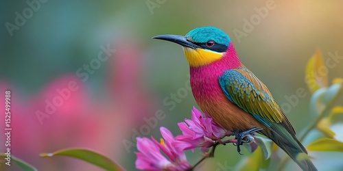 © Arcopollo, Obraz premium A vibrant and colorful Bee-eater perched on a blossoming branch in spring
