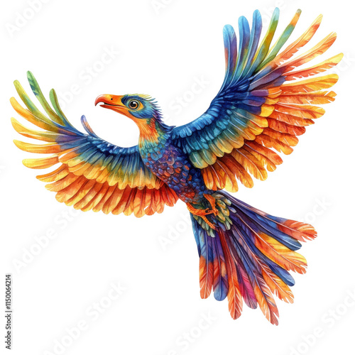 © teera, Fototapeta premium A vibrant and colorful bird in flight, showcasing intricate feather patterns against a white isolated background.