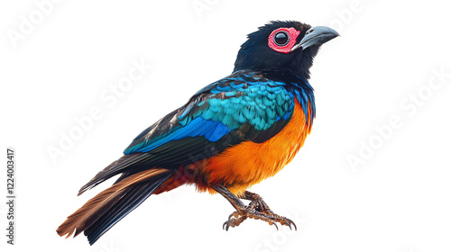 © Phuwadon, Fototapeta premium A vibrant and colorful bird with striking hues of blue, orange, and black, perched gracefully against a white isolated background.