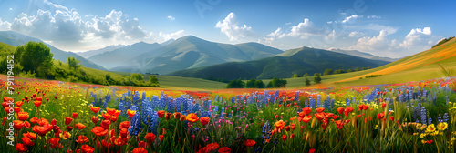 Fototapeta premium A vibrant and colorful flower landscape with mountain scenery, fields, and a summer holiday atmosphere.