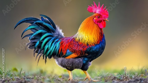 © embun, Fototapeta premium A vibrant and colorful rooster standing in grassy outdoor environment