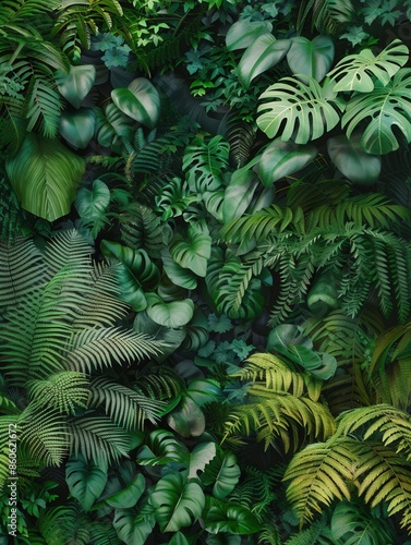 Fototapeta premium A vibrant and dense tropical rainforest with various plant species,...