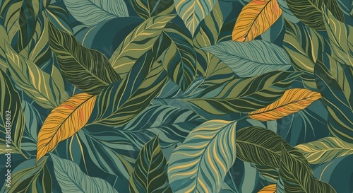 Fototapeta premium A vibrant and detailed illustration of lush tropical leaves in various shades of green and yellow, creating a dense, naturalistic pattern.