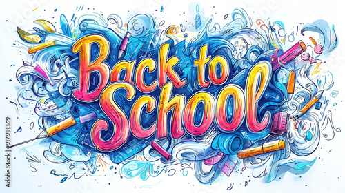 © LarisaM, Naklejka premium A vibrant and energetic "Back to School" illustration featuring bold, colorful typography set against a lively urban cityscape. The hand-drawn style captures the excitement and bustling atmosphere of