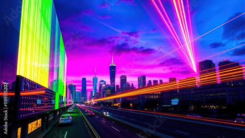 Fototapeta premium A vibrant and futuristic cityscape at dusk, illuminated by a mesmerizing...