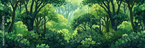 © Naru, Obraz premium A vibrant and intricate seamless pattern background showcasing a lush forest with tall trees, dense foliage, and dappled sunlight. The pattern symbolizes nature's abundance, tranquility, and the inter