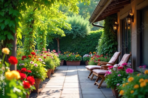 Naklejka premium A vibrant and inviting patio garden overflowing with colorful flowers and...