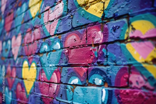 Fototapeta premium A vibrant and playful brick wall with hand-painted hearts, perfect for...