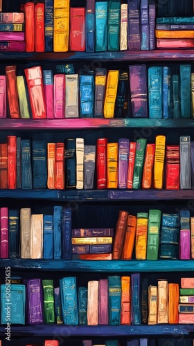 © gen_pick, Naklejka premium A vibrant and seamless book-themed pattern featuring colorful books arranged like a bookcase, perfect for lively backgrounds, decor, and educational themes.
