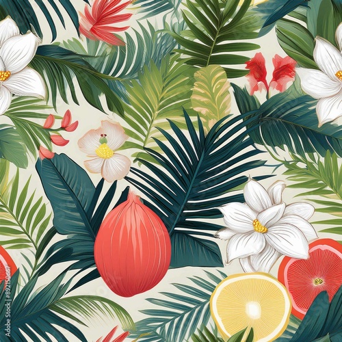 Fototapeta premium a vibrant and unique tropical pattern featuring lush palm leaves, exotic flowers, leaf