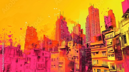 © Jesse, Obraz premium A vibrant and visually striking illustration of an urban landscape, showcasing towering skyscrapers amidst a backdrop of bold orange and yellow hues. The buildings are represented in shades of pink an