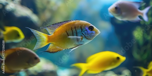 Fototapeta premium A vibrant aquarium scene with a variety of colorful fish swimming around a...