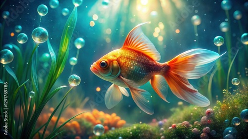 Fototapeta premium A Vibrant Aquatic Scene Featuring an Ornate Goldfish Swimming Gracefully Amidst Lush Underwater Flora and Shimmering Bubbles