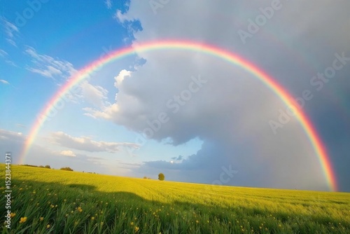 © Poom, Naklejka premium A vibrant arc of color streaks across a clear sky, a breathtaking rainbow seemingly in flight, defying gravity with ethereal beauty , optical, phenomenon, ethereal