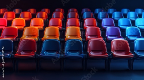 Naklejka premium A vibrant arrangement of colorful chairs in rows against a dark background,...