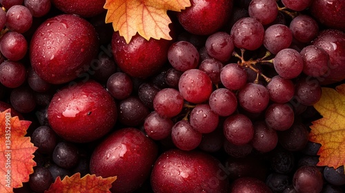 © Shomixer, Obraz premium A vibrant arrangement of fresh red grapes and plums surrounded by beautiful autumn leaves creates a stunning fall display highlighting seasonal fruits and natural beauty.