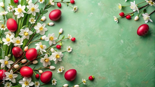 Obraz premium A vibrant arrangement of red Easter eggs and spring flowers for festive...