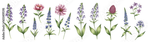 Naklejka premium A vibrant arrangement of various flowers in shades of pink, purple, and blue, capturing nature's beauty.