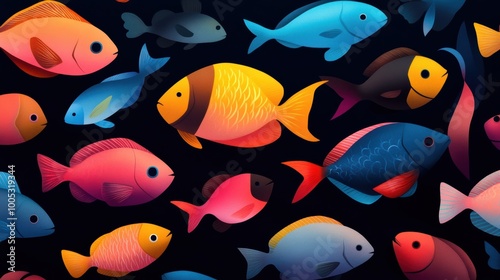 Naklejka premium A vibrant array of bioluminescent deep sea fish swimming through the dark...