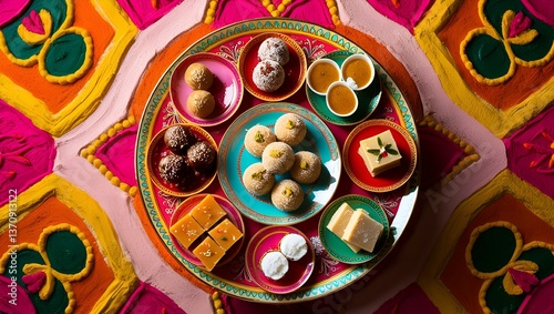 Fototapeta premium A vibrant array of festive Indian sweets arranged on a colorful platter,...