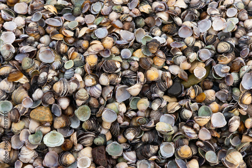 © Aliaksandr, Naklejka premium A vibrant array of seashells creates a captivating coastal texture, showcasing a diverse collection of natural patterns and colors.