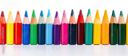 Fototapeta premium A vibrant array of wax crayons arranged on a white background seen from a...