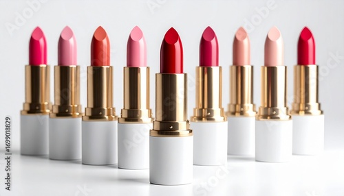 © jadid, Obraz premium A vibrant assortment of colorful lipsticks in elegant gold and white tubes, showcasing a palette of reds, pinks, and nudes for beauty