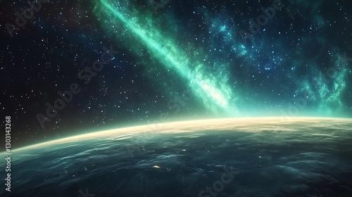 Fototapeta premium A vibrant aurora spanning the horizon of a far-off planet under a star-filled...