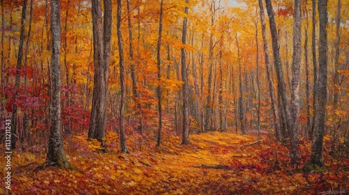 © aritha, Obraz premium A vibrant autumn forest scene with colorful leaves and a winding path.