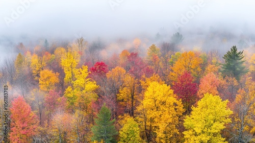 Fototapeta premium A vibrant autumn forest shrouded in mist, showcasing colorful foliage.