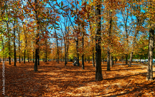 Naklejka premium A vibrant autumn scene in the Tuileries Garden, Paris, with golden and orange leaves on the trees and covering the ground.