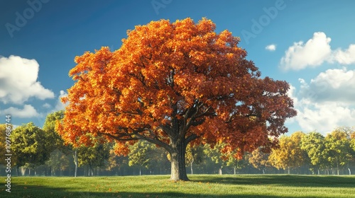 Naklejka premium A vibrant autumn tree with brilliant orange foliage stands majestically...