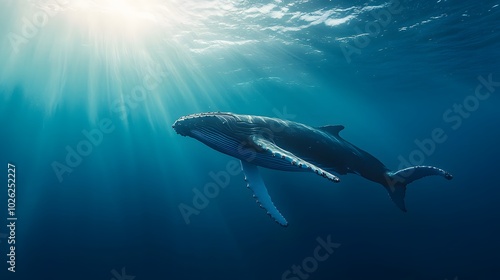 Fototapeta premium A vibrant azure ocean with sunbeams illuminating a majestic humpback whale swimming gracefully, captured in underwater photography that showcases serene marine beauty deep blue hues.