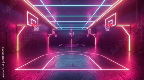Naklejka premium A vibrant basketball court illuminated by neon lights, creating a dynamic and...