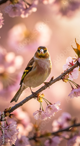 © Hamid, Naklejka premium A vibrant bird, perched on a blossoming cherry tree branch, is captured in a close-up shot against a soft, blurred background of pink flowers.