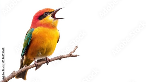 © watcharee, Fototapeta premium A vibrant bird with a striking red, yellow, and green plumage perched on a branch, singing.