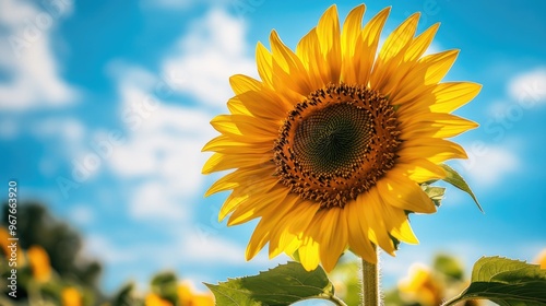 © 69, Fototapeta premium A vibrant, blooming sunflower with its large, yellow petals and dark center, set against a bright blue sky.