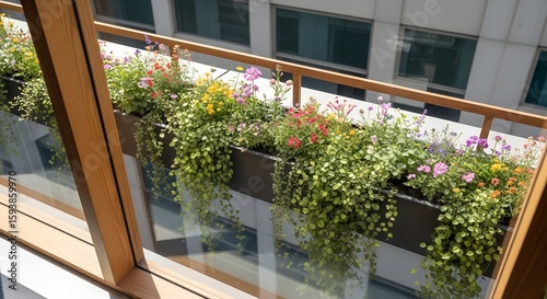 Fototapeta premium A vibrant blooming window box, bursting with colorful flowers and trailing green vines, adds a touch of nature to a modern office building, reflecting the biophilic workplace theme.