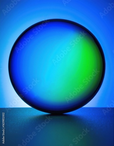 © bestimagestock, Obraz premium A vibrant blue and green sphere rests atop a polished wooden table, casting soft shadows and reflecting light, creating a striking focal point.