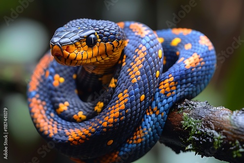 © Design By Reiga, Obraz premium A vibrant blue and orange snake coiled around a branch in a rainforest.