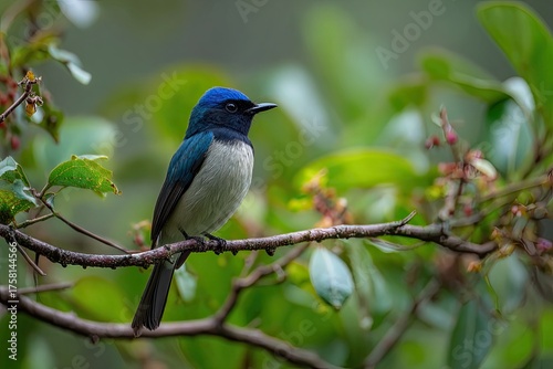 © ika, Fototapeta premium A vibrant blue and white bird perches on a branch amidst lush green foliage