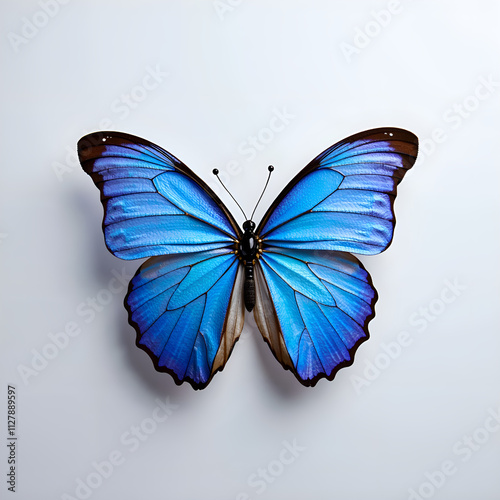 © Wuttichai, Fototapeta premium A vibrant blue butterfly displaying intricate patterns against a soft background, photography of natural history concept.