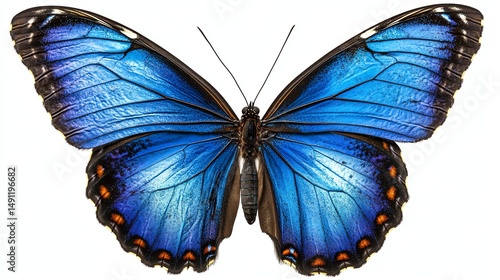 © BozStock, Fototapeta premium A vibrant blue butterfly with fully spread wings is prominently displayed in the stock photo.
