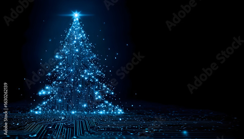 Naklejka premium A vibrant blue Christmas tree glimmering with lights against a dark background, symbolizing holiday joy and celebration in a modern, digital era.