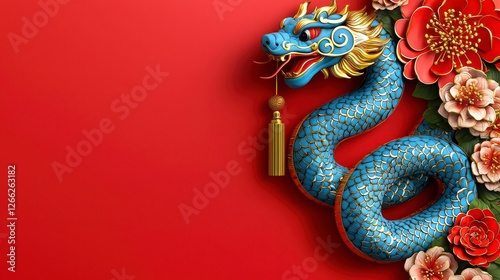 Obraz premium A vibrant blue dragon entwined among red flowers, set against a rich red background, symbolizing prosperity and good fortune.